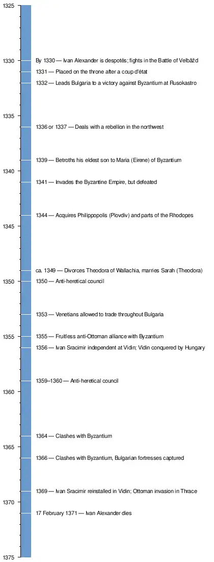 Ivan Alexander was the son of the Despot Sracimir of Kran by Petrica, a sister of Michael Asen III of Bulgaria.[8] Therefore, Ivan Alexander was a nephew of Michael Asen III.[5][6] Paternally, Ivan Alexander descended from the Asen dynasty.[5][6] By 1330 Ivan Alexander was himself a despot and governed the city of Lovech. Together with his father and his father-in-law Basarab of Wallachia, Ivan Alexander fought in the Battle of Velbazhd against the Serbs at modern-day Kyustendil in 1330, in which Bulgaria suffered defeat. The defeat, combined with the worsening relations with the Byzantine Empire, precipitated an internal crisis, which was exacerbated by an invasion of the Byzantines. A coup d'état drove Ivan Stefan out of the capital Tarnovo in 1331, and the conspirators placed Ivan Alexander on the throne.[9]