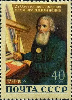 Ivan Petrovich Kulibin (April 21, 1735 – August 11, 1818) was a Russian mechanic and inventor. He was born in Nizhny Novgorod in the family of a trader. From childhood, Kulibin displayed an interest in constructing mechanical tools. Soon, clock mechanisms became a special interest of his. His realizations as well as his prolific imagination inspired the work of many.
