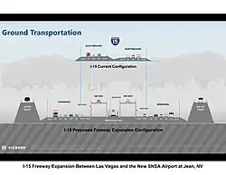 The SNSA will be accessible from Las Vegas via Interstate 15 (I-15) at the Jean exit, as well as from the towns of Goodsprings and Sandy Valley via Nevada State Route 161. Brightline West is also expected to run in tracks located between I-15 and the airport, with potential for a future connection.