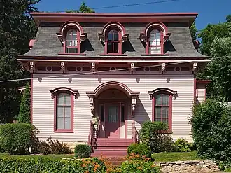 The official National Register documentation for the Ivory McKusick House gives a construction date of 1868.[4] However more recent research from the Washington County Historical Society states that the house began as a one-story structure in 1866 and was enlarged in 1872 with the two-story wing that now serves as the main façade.[2] Second Empire architectural elements include the mansard roof with round-arched dormers, and numerous ornate brackets. These brackets adorn the window hoods on the dormers and the first floor, while even larger brackets with pendants support the wide eaves and the hood over the front door.[4] The heavy mansard roof was highly fashionable at the time.[2] A patterned frieze wraps under the roofline and is echoed in decoration around a bay window on the side elevation. Decorative elements are simpler on the original rear wing and lacking altogether on a two-story servants' wing added to the northwest corner of the house sometime before 1888.[4]