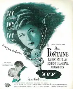 Ivy is a 1947 American crime drama film directed by Sam Wood and starring Joan Fontaine, Patric Knowles, Herbert Marshall and Richard Ney. It written by Charles Bennett, based on the 1927 novel The Story of Ivy by Marie Adelaide Belloc Lowndes. It was distributed by Universal Pictures. The film was entered into the 1947 Cannes Film Festival.[1]