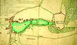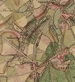 The placename was first mentioned in 1210 as Elsela, from the Old Dutch Else(n)lo, meaning alder woods.[4] The origins of the village date from the foundation of La Cambre Abbey. Hendrik I, Duke of Brabant, donated the Pennebeke domain[a] to the Cistercian nun Gisela in 1201. She in turn founded the Abbey, and in 1210, acquired property on which the duke ordered the construction of a mill.[5] The marshlands around the Abbey were later drained and sanitised, which resulted in four springs which served as a source of fish for the Abbey's inhabitants and the neighbouring hamlets.[6] The Abbey was located near the springs of the Maelbeek stream in the Sonian Forest, the remnant of which closest to Brussels became known as the Bois de la Cambre/Ter Kamerenbos in the 19th century. The Abbey was recognised by Jan III van Bethune, the Bishop of Cambrai in 1202, soon after its foundation.[7] The saints Boniface of Brussels and Alice of Schaerbeek were two of its most famous residents in the 13th century.