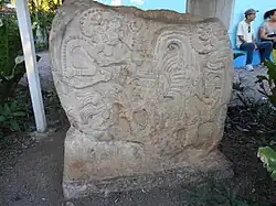 Four Classic Period sculpted monuments were recovered from the site, two stelae and two altars.[17] Ixlu Stela 1 bears the date 879 AD, in the Late Classic Period, and depicts a ruler who used the Tikal Emblem Glyph and the K'ul Mutul Ahaw title ("holy lord of Tikal").[18] The stelae at Ixlu resemble traditional Classic Period stelae such as those at Tikal.[19] Both Stelae 1 and 2 show bloodletting rituals and the materialisation of the Paddler Gods.[19] Ixlu Stela 2 is now located in the main plaza of Flores.[20]