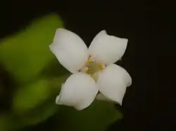 Small scented flowers are produced in clusters in the leaf axils and are more or less sessile. They are tubular and have four recurved lobes about 4 mm (0.16 in) long. They have four stamens, of which only the tips reach beyond the corolla lobes, and a slightly longer style. The ovary has four locules and the stigma has four spreading lobes.[4][5][6]