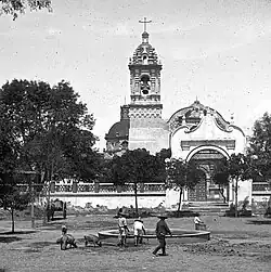 Just after the Conquest, the area belonged to a territory called San Juan de Dios ruled directly from Mexico City.[9] A small monastery dedicated to Saint Matthew was constructed in which lived no more than two monks, with no more than 300 indigenous. As the area was very sparsely populated, these monks did not establish satellite parishes, except for the San Antonio hermitage, built for the feast day of this saint. In the middle of the 17th century, baptisms began to be recorded in the area, which then consisted of the main community and eight surrounding neighborhoods called barrios.[5][11] Through the colonial period, Iztacalco was on an island, which impeded its growth. It had only 296 residents in its barrios of Asunción, Santa Cruz, Santiago, San Miguel and Los Reyes.[11]