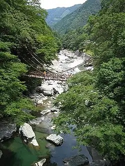 The Iya Valley is known for its unique Vine Bridges (called "kazurabashi") over the Iya River, made of several tons of Actinidia argute (hardy kiwi) vines from the surrounding mountains.[18] At one point there were 13 of them, but now only 3 remain: the main Iya-no-Kazurabashi in Nishi-Iya, and the Oku-Iya Double Vine Bridges ("Oku-Iya Niju Kazurabashi") located at the furthest end of Higashi-Iya near the base of Mt Tsurugi. The main Iya-no-Kazurabashi, 45 meters in length, is classified as an important Tangible Folk Culture Property. Its vines are replaced every 3 years and reinforced with steel cables for safety.[19]