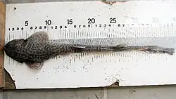 The Izak catshark or simply Izak (Holohalaelurus regani) is a species of shark belonging to the family Pentanchidae, the deepwater catsharks. This species is common off the coasts of South Africa and southern Namibia. It typically inhabits the outer continental shelf at depths of 100–300 m (330–980 ft), with the males found deeper than the females and juveniles. The Izak catshark has a short, wide, flattened head and a robust body tapering to a long, slender tail. It can be identified by its ornate color pattern of dark brown spots (in juveniles) or reticulations and blotches (in adults) on a light yellowish background, as well as by the enlarged dermal denticles over its pectoral fins and along its dorsal midline from the snout to the second dorsal fin. This species reaches 69 cm (27 in) in length, with the males larger than females.