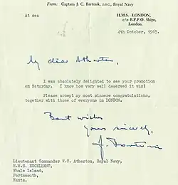 In 1948 Bartosik was one of only three Polish officers to be accepted into the Royal Navy out of several hundred who volunteered.[3] It meant relinquishing his wartime rank of lieutenant commander, and he was appointed to the battleship HMS Anson as a lieutenant with seniority from July 1941. His draft to Anson was nearly rescinded when her captain noticed that Bartosik dared to sport his Polish Virtuti Militari ahead of his British DSC. He was dispatched to serve on escort vessels. From 1955 to 1958 he was the commander of the frigate HMS Comus. From September 1959 he led the 5th Frigate Squadron from HMS Scarborough. From 1962 to 1963 he was commander of Royal Naval Air Station RNAS Culdrose. From 1964 to 1965, he commanded the guided missile destroyer HMS London, and from 1966 to 1968 he was Assistant Chief of Naval Staff (Operations), with the rank of rear admiral. He retired from the Royal Navy in August 1968.[4]
