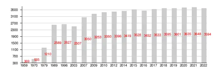 | Population | 369 | 535 | 1210 | 2589 | 2627 | 2507 | 3050 | 3253 | 3350 | 3396 | 3419 | 3528 | 3452 | 3533 | 3595 | 3601 | 3635 | 3648 | 3594 |