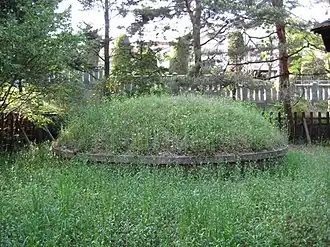 In 1950, at a construction site near Seitaka shrine in Matsumoto City, a human body was found. In the next few weeks, additional bodies were found. The number of the unearthed bodies came to eighteen. Seventeen bodies were clustered, and one[18] was found apart from the rest. Four of the seventeen bodies were headless, which coincides with the story handed down by tradition.[19] And one of the seventeen clustered bodies had a larger pelvis and slender bones. Taking these into consideration, historical and medical researchers of the time concluded that it was highly possible that the seventeen clustered bodies were those of the executed farmers of the Jōkyō Uprising.[20] (The one with a larger pelvis must be Oshyun's body. Oana Zembei's body was also easily identified by its long bones, because he had been known for being tall.) In 1952, the bodies were buried in a mound, and the mound has been called Gimin-zuka. Every year on the anniversary day of the executions of the Gimin, a memorial service is held in front of the mound.[21]
