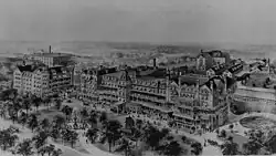 Ellen G. White, who had proclaimed that a cleansing sword of fire was poised over the increasingly "worldly" and business-oriented Battle Creek, was against rebuilding the large institution.[29][30] Although she apparently wrote a manuscript testifying against the rebuilding in 1902, it was not sent to Kellogg at that time,[29] and Kellogg did not directly consult her about his plans.[23]: 38 With support of the board of directors, he not only rebuilt the institution, but doubled its size. The new building was designed by architect Frank Mills Andrews of Ohio[31] and opened on May 31, 1903.[15]: xiii–xv [26]: 189 Designed to be fireproof, the new brick building was six stories high, with an elegant frontage extending 550 feet along Washington Avenue, and three wings opening out behind. It included, among other things, a solarium and palm court, and it cost more than $700,000.[32]
