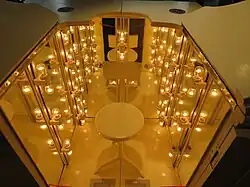He constructed his first incandescent light bath in 1891, claiming to treat thousands of patients at the Battle Creek Sanitarium before exhibiting the bath at the World's Columbian Exposition in Chicago in 1893.[75] The invention reportedly aroused little attention there but was brought back to Germany, where it began to be manufactured and sold.[75] It was spread to Vienna by Kellogg's friend Dr. Wilhelm Winternitz; installed in royal palaces across Europe; and popularly replaced old Turkish steam baths at athletic clubs.[16] Only after cabinet baths became popular in Europe did demand within the United States develop. It was imported from Berlin to New York "as a therapeutic novelty".[75] In 1896, Kellogg patented the radiant-heat bath in the United States (US558394).