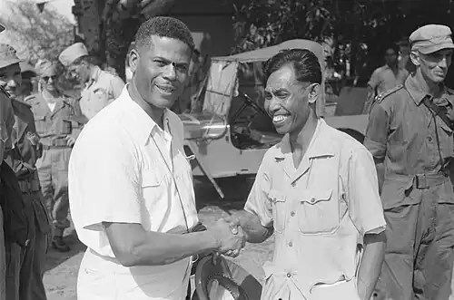 Leimena was based in Jakarta in the early days of the revolution, but moved alongside the rest of Sjahrir's cabinet in 1946 to Yogyakarta as Jakarta was being increasingly controlled by the Dutch.[28] Leimena was an important member of the Indonesian negotiating team in agreements with the Dutch.[30] He was part of the Indonesian delegation to the Linggadjati Agreement of November 1946,[31] and the Renville Agreement of January 1948 (during which, Leimena remarked, the Indonesian side accepted the Dutch terms under American pressure).[32] After Operation Kraai, Leimena evaded capture and attended talks in Jakarta with representatives from the federal states of the United States of Indonesia in January 1949.[33] During the Roem–Van Roijen Agreement, Leimena also participated in negotiations, and he further participated in the Dutch–Indonesian Round Table Conference in The Hague, leading Indonesia's military delegation.[34]