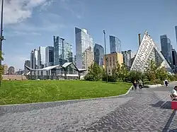 The state's first memorial to the LGBT community was dedicated in June 2018, at Hudson River Park near the Christopher Street Pier. The memorial, an abstract work by Anthony Goicolea, consists of nine boulders arranged in a circle. The memorial honors the victims of the 2016 Orlando nightclub shooting, most of whom were gay.[32] The Pier 54 project, later renamed Little Island, opened in May 2021.[33] Additionally, in early 2020, Cuomo announced that he would expand the park onto Pier 76, which contained a New York City Police Department tow pound that was in the process of closing.[34] Pier 76 opened on June 9, 2021, under the existing canopy of the former tow pound.[35][36] In 2022, Manhattan borough president Mark Levine proposed converting one lane of the West Side Highway into a bike path due to heavy traffic on Hudson River Park's bike lane.[37][38] Gansevoort Peninsula opened in the West Village in late 2023.[39][40] By then, the park attracted 17 million annual visitors and had spurred commercial development along the West Side, including the IAC Building and a redevelopment of St. John's Terminal.[18]