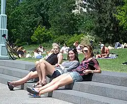 Abundant open grassy areas in the park permit non-athletic leisure activity. Suntanning is a popular pastime in many areas.[26][47] Clinton Cove (55th Street), Pier 84 (44th Street),[46] the 14th Street Park, and Pier 45 are all wide unobstructed green spaces for sunbathing, and are popular locations.