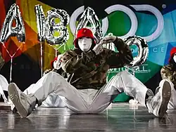 Since ABDC, the Jabbawockeez have appeared in Pepsi,[4][6] Ford, and Gatorade commercials,[4] and performed on Dancing with the Stars, So You Think You Can Dance, The Ellen DeGeneres Show,[7] and Live with Regis and Kelly. They also made a cameo appearance in Step Up 2 The Streets,[8] launched their own clothing line, and toured with New Kids on the Block,[4][9] and Jesse McCartney.[4] Along with the ABDC season two winner, Super Cr3w, Jabbawockeez were the opening act for the Battle of the VMAs ABDC special.[10][11] The group made an appearance on Cycle 13 of America's Next Top Model in the episode "Dance With Me" to help the contestants learn how to convey emotions with their bodies. They starred in Shake It Up, a Disney Channel comedy show. On February 15, 2009, they accompanied and danced with NBA All-Star center Shaquille O'Neal in his NBA All-Star Game player introduction.[12] On October 16, 2009, they performed in front of a crowd of 35,000 at the University of Florida's Gator Growl.[13] They performed for DECA's 66th Annual International Career Development Conference in Salt Lake City. Jabbawockeez returned to America's Best Dance Crew on June 5, 2011, to perform on the Season 6 finale. On May 19, 2013, they were backup dancers for Taylor Swift's performance at the 2013 Billboard Music Awards. They appeared in Season 7, Episode 2 of The Bachelorette with Ashley Hebert.[14] They starred in DaBaby's "BOP on Broadway" music video in 2020. They are featured on NBA 2K23 as a part of the halftime show.