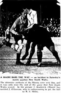 He played again in their second match against New South Wales on 10 August in Sydney.[64] Before 20,000 spectators at the Sydney Cricket Ground the Māori side won 14–5 to win their series against NSW with the Prime Minister of New Zealand, George Forbes in attendance. Early in the second half with the score 3–0 to NZ Māori Brodrick was involved in a dangerous burst with Jack Hemi and C. Smith all handling and NSW was said to be “lucky” to avoid conceding a try.[65] The Sydney Mail published a photograph of Brodrick tackling J. O’Gormon.[66] The Referee publication in Sydney reported that “Brodrick and Rodgers also played havoc among our inside men who were standing too far up on the opposition when New South Wales won the ball. These two men have yeoman service, and were instrumental in stopping our backs from getting going”. He also gave Gibbons, the halfback a “torrid time” along with Harrison.[67]