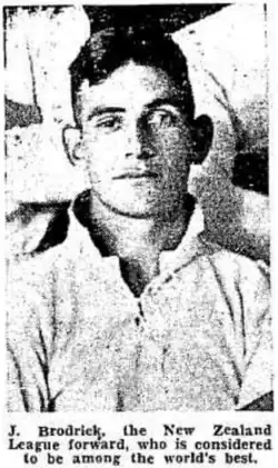 At the start of 1933 Brodrick joined the Ruatoki team where he had grown up. He played in their first match on 6 May against Paroa.[13] He then played in matches against City on 20 May, Whakatane on 27 May, Poroporo on 10 June, and City again on 24 June.[14][15][16][17]