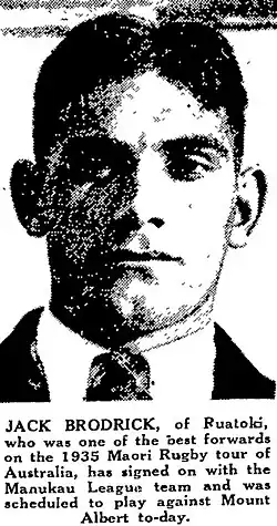 Jack Brodrick grew up in the Ruatoki area and attended Whakatane High School where he played in the 1st XV rugby union team. After leaving school he spent time in the Rangitaiki District (between Whakatāne and Te Puke) before returning to the Bay of Plenty.[4] The first mention of his involvement in rugby post high school was in 1931 for the Rangitaiki sub union team against Ōpōtiki. He was named in the reserves for the 27 June match when he would have been aged about 18.[5] He was named in their reserves once again on 12 July for a match with Te Puke at Matatā but he in fact played in the game.[6] The Bay of Plenty Times said that Brodrick played a “solid game” in the second row of the forwards.[7] Brodrick's Rangitaiki side lost 10–12 to a last minute penalty to claim the Apanui Shield.[8] Brodrick then played in a match against Whakatane on 1 August which they won 5–3.[9][10] Rangitaiki played again 2 weeks later on 15 August with Brodrick playing well in the second row in a 15–8 loss. The Bay of Plenty Times said “Broderick secured and made a great run, being pushed out near the line”, then towards the end of the game he secured the ball from a high attacking kick and passed “to Anderson, who pushed his way over the line” to score.[11]