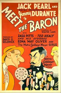 The success of his first radio series brought him to the attention of Metro-Goldwyn-Mayer. He starred as his character in one feature film, Meet the Baron (1933)[2] with Jimmy Durante, Edna May Oliver, ZaSu Pitts and the Three Stooges. He also appears in Ben Bard and Jack Pearl (1926), a film of their vaudeville act made in the DeForest Phonofilm sound-on-film process, and Hollywood Party (1934).