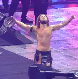 On April 21, 2024, Perry, with his new "Scapegoat" persona, returned to AEW at Dynasty and helped the Young Bucks defeat FTR to win the AEW World Tag Team Championship.[53] On the April 24 episode of Dynamite, Perry was revealed as a member of The Elite alongside the Young Bucks and Kazuchika Okada. At the end of the episode, Perry and the rest of The Elite attacked AEW President and CEO Tony Khan.[54] At Double or Nothing on May 26, The Elite defeated Team AEW (Bryan Danielson, Darby Allin and FTR) in an Anarchy in the Arena match, where Perry scored the winning pin on Danielson.[55] On the June 12 episode of Dynamite, Perry defeated Dustin Rhodes to qualify for the ladder match for the vacant AEW TNT Championship at Forbidden Door on June 30.[56] At Forbidden Door, Perry was able to win the ladder match and capture the TNT Championship for the first time. As TNT Champion, Perry would defend his title on Dynamite and Collision in a series of open challenges, successfully defending it against Marko Stunt, Lio Rush, Christopher Daniels, Minoru Suzuki, and Action Andretti.[57][58][59][60][61] At Blood & Guts, The Elite were defeated by Team AEW (Allin, Swerve Strickland, Mark Briscoe and The Acclaimed (Max Caster and Anthony Bowens)) after Matthew Jackson surrendered to save Perry from being set on fire by Allin. On the August 17 episode of Collision, Perry unveiled his custom TNT Championship belt, featuring the default design but completely spray painted black with red paint splattered on the main plate (mimicking blood) and a warped and tattered leather strap.[62] At All In, Perry successfully defended his TNT Championship against Allin in a coffin match. On the following episode of Dynamite, Perry attacked Danielson, then-AEW World Champion, and unsuccessfully challenged him to a match at All Out.[63] On October 12 at WrestleDream, Perry successfully defended his title against Katsuyori Shibata.[64] On November 23 at Full Gear, Perry lost the TNT Championship to Daniel Garcia, ending his reign at 146 days.[65]