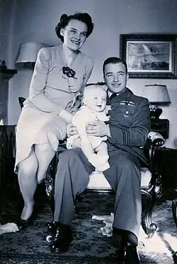 Beirnes was repatriated to Canada on 15 November 1944 for a rest.[2] He was transferred to No.8 (aircraft) Repair Depot in Winnipeg in charge of test pilots.[6] He was only there for a short time, going on 30 days leave in mid-February. There he saw his baby son Gordon, born in August 1944, for the first time. These short few months in Winnipeg would unfortunately be the only time the family would be together. Events at the squadron back in Europe would greatly influence his future. The tour of his replacement at the head of 438 Squadron, S/L Reid, expired on 31 December, and he relinquished command to Flight Lieutenant Peter Wilson, who was killed the very next day, 1 January 1945, during an enemy dawn air raid on their airfield.[8] Wilson was succeeded by the newly promoted S/L James Easson Hogg D.F.C., transferred from 440 Squadron on 20 January.[4] Unfortunately, S/L Hogg lost his life in a training accident on 23 March.[9] Beirnes had already volunteered to return to Europe and left Canada on 11 March, arriving in the UK on 18 March.[6]