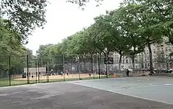 Jackie Robinson Park contains two playgrounds along the Bradhurst Avenue end, both with restrooms. The playgrounds are named after their respective cross streets, spelled out and in Roman numerals. Playground One Forty Nine CIL is at 149th Street, while Playground One Fifty Two CLII is between 152nd and 153rd Streets.[13] The playground at 152nd Street was previously the park's wading pool.[14][b] There is also a recreational area along Bradhurst Avenue between the two playgrounds. This consists of two baseball fields at 150th Street,[15] one basketball court south of 150th Street, and four handball courts at 151st Street.[10] The sporting fields and playgrounds were built in 1936, as part of the Works Progress Administration (WPA) program, and have been modified since then.[16]
