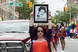 By the late 1980s, Jackson Heights had rising real-estate values and a moderate amount of crime compared to other city neighborhoods.[52] Nevertheless, there were still high-profile crimes that reinforced perceptions of the neighborhood as dangerous. In 1990, Julio Rivera, a gay Puerto Rican man, was murdered in a hate crime. His death galvanized the LGBTQ community into protesting his death with a candlelight vigil, the formation of several LGBTQ activist groups, and the foundation of the Queens Pride Parade.[53] Two years later, journalist Manuel de Dios Unanue was murdered after authoring articles in El Diario La Prensa about the proliferation of Colombian cartels embedded within the business community along Roosevelt Avenue.[54] Seeking to distance themselves from the portrayal of Jackson Heights as a crime-ridden neighborhood, some residents argued that de Dios had been murdered in Elmhurst, as the restaurant where he was attacked was on the south side of Roosevelt Avenue.[47]