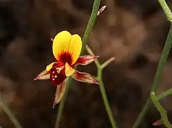 Jacksonia racemosa is an erect to prostrate, spindly shrub that typically grows to 0.1–0.6 m (3.9 in – 1 ft 11.6 in) high and 0.2–1.5 m (7.9 in – 4 ft 11.1 in) wide, its branches greyish-geen, with sharply-pointed branchlets 5–9.3 mm (0.20–0.37 in) long and 0.3–0.4 mm (0.012–0.016 in) long at the base of the plant. Its leaves are reduced to dark-brown, narrowly egg-shaped scales, 0.4–1.3 mm (0.016–0.051 in) long, 0.25–1.0 mm (0.0098–0.0394 in) wide and sometimes have toothed edges. The flowers are scattered along the branches on pedicels 1.5–5.4 mm (0.059–0.213 in) long, with narrowly egg-shaped bracteoles 0.6–1.2 mm (0.024–0.047 in) long and 0.3–0.4 mm (0.012–0.016 in) side on the middle of the pedicels. The floral tube is 0.3–1.4 mm (0.012–0.055 in) long and the sepals are membranous, with lobes 5.0–7.7 mm (0.20–0.30 in) long and 1.1–1.6 mm (0.043–0.063 in) wide. The standard petal is yellow with red markings, 5.3–6.7 mm (0.21–0.26 in) long and 5.0–7.4 mm (0.20–0.29 in) broad, the wings yellow with red markings, 4.8–5.4 mm (0.19–0.21 in) long, and the keel is dark red, 5.0–6.3 mm (0.20–0.25 in) long. The stamens have white, pink or red, filaments 0.4–0.6 mm (0.016–0.024 in) long. Flowering occurs from July to February, and the fruit is a woody, narrowly elliptical pod 4.3–4.7 mm (0.17–0.19 in) long, 1.5–3.1 mm (0.059–0.122 in) wide and glabrous or with white hairs pressed against the surface.[2][3]