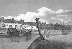 In the 1840s it became "a site of radical activity",[3] and, after attention from novelists Charles Dickens and Charles Kingsley, joined other London areas of "literary-criminal notoriety" that emerged "as symbols of a developing urban counterculture".[4] The 19th-century social researcher Henry Mayhew described Jacob's Island as a "pest island" with "literally the smell of a graveyard" and "crazy and rotten bridges" crossing the tidal ditches, with drains from houses discharging directly into them, and the water harbouring masses of rotting weed, animal carcasses and dead fish.[5] He describes the water being "as red as blood" in some parts, as a result of pollutant tanning agents from the leather dressers in the area.[5][6]