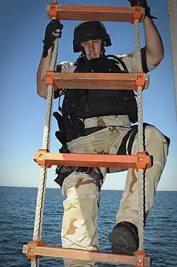 The term Jacob's ladder,[1] used on a ship, applies to two kinds of rope ladders.[2] The term may also appear without the apostrophe, as Jacobs ladder.