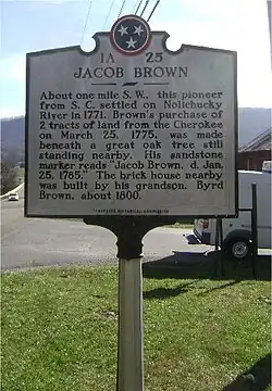 It is noted on the Tennessee Historical Marker in Greene County that in 1771 Jacob Brown came to the Nolichucky River and set up tents on the northern bank. From this location he conducted trade with the Cherokee.[1] In 1772 he leased a tract of ground on the Nolichucky from the Cherokee. The consideration was said to be a horse load of goods.[2] The exact boundaries of the lease is not known.[1]