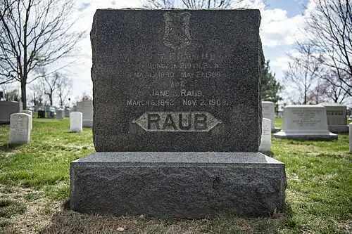 Raub and his wife Jane S. (1842–1908) are buried at Arlington National Cemetery.[4]