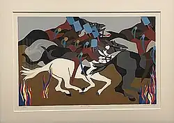 Between 1954 and 1956 Lawrence produced a 30-panel series called "Struggle: From the History of the American People" that depicted historical scenes from 1775 to 1817. The series, originally planned to include sixty panels, ranges from references to current events like the 1954 Army-McCarthy hearings and relatively obscure or neglected aspects of American history, like a woman, Margaret Cochran Corbin, in combat or the wall built by unseen enslaved Blacks that protected the American forces at the Battle of New Orleans.[14] Rather than traditional titles, Lawrence labeled each panel with a quote. He titled a panel depicting Patrick Henry's famous speech with the less well-known passage: "Is life so dear, or peace so sweet, as to be purchased at the price of chains and slavery." A panel depicting an African American slave revolt is titled with the words of a man who sued for emancipation from slavery in 1773: "We have no property! We have no wives! No children! We have no city! No country!"[15] The fraught politics of the mid-1950s prevented the series from finding a museum purchaser, and the panels had been sold to a private collector who re-sold them as individual works.[16] Three panels (Panels 14, 20 and 29) are lost, and three others were only located in 2017, 2020, and 2021.[17] In 2021 the Peabody Essex Museum organized an exhibition all 30 of the panels including the newly discovered ones and reproductions of the works too fragile to travel or whose location is unknown.[18]