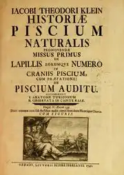Klein published Historiae Piscium Naturalis, in Danzig, in five parts from 1740 to 1749. The first part (1740), dedicated to the Royal Society, focused on understanding the auditory capacity of cartilaginous and spinose fishes. According to John Eames (1742), until the publication of the work, it was believed to have been understood that only cetaceous fish were known to have auditory passages, or ear holes, and that the question of whether fish could hear was still not understood. Aristotle claimed, in his "History of Animals," that fishes possessed no evident auditory organs, but believed that nonetheless they must hear.[11] In the Preface, Klein cites the work of Giulio Casare Casseri, who discovered bones in the heads of Pike or Jack fish, which he understood to be their organs of hearing, though he did not discover any manifest external auditory passages. In section of the essay titled De Lapillis, eorumque Numero in Craniis Piscium (roughly translated as “The bones, their number in the skull of Fish”) Klein considers what parts of the head of fish serve as the organ of hearing, and by what passages the sensation of sound is communicated to them. He refers to these bones as Ossicula – little bones – and considers them essential parts of the head, generated with the brain itself. Now known as otoliths, he notes that they scale proportional to the size of the fish, and are most easily discovered in the heads of bony fish. Klein identifies three otoliths to correspond to the Incus, Malleus and Stapes of other animals. The first are the two largest, which he explains are easily found; the other two pairs, he explains, are small, difficult to find, enveloped in distinct fine membranes. Klein also suggested that one could determine the age of fish by analysing the number and thickness of the Laminae and fibres of these bones. Otoliths are now known to acquires a growth ring every day for at least the first six months of its life.[12] Klein inquiries into the nature of the passages by which vibrations produce a sense of hearing. He inspects the head of a Pike fish and observes several holes with bristles which lead to the auditory bones. He later dissected a Sturgeon fish and traced the auditory duct to the membrane in which the three bones are placed. Klein concludes that fishes do indeed have hearing organs and passages, communicated to through slight vibrations, though these passages are not easily demonstrable in many species. He observes that the auditory organs of cetaceans are different from those of cartilaginous and bony fishes. He adds that water does not act as an impediment to hearing, but rather is the “intermedium” by which sound is communicated.[13][14]
