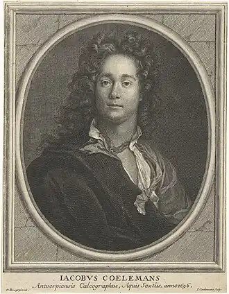 Jacobus Coelemans or Jacob Coelemans, known in France as Jacques Coelemans (Antwerp, 23 August 1654 – Aix-en-Provence, 11 February 1732) was a Flemish engraver and printmaker, known for his reproductive prints after famous painters and portraits. He trained in his native Antwerp and later moved to Aix-en-Provence in France where he worked for the remainder of his life.[1]