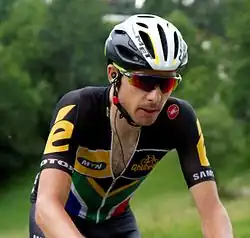 ![]() Janse van Rensburg at the 2015 Tour de France in his National champions jersey | |