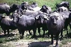 Jafarabadi buffalo, Jaffrabadi buffalo or Gir buffalo[1] is a domesticated riverine buffalo that originated in Gujarat, India.[2] It is estimated that there are about 25,000 Jafarabadi buffaloes in the world.[3] It is one of the important buffalo breeds of India and Pakistan.[4] The Jafarabadi buffalo is also the first buffalo breed exported to Brazil,[5] and is also one of the four buffalo breeds raised in Brazil as of 2017, the others being Mediterranean, Murrah and swamp buffalo.[6]