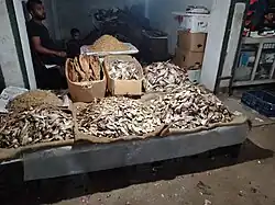 Vendors in the market also offer over hundred types of dried fish, including popular ones like Goroi maas (Channa punctatus), Ari maas (Aorichthys seenghala), Puthi maas (Puntius siphore), and Rohu (Labeo rohita).[6]