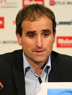 In July 2012, Arrasate was promoted to Real's first team as assistant to Philippe Montanier.[5] The following year, as the Frenchman left for Rennes, he was named his successor.[6] He debuted in La Liga on 17 August with a 2–0 home win against Getafe,[7] and led the team in their campaign in the UEFA Champions League, in which they defeated Lyon to qualify for the group stage for the first time in a decade,[4] but finished bottom of the table.[8]