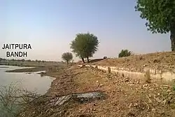 Jaitpura has a hot semi-arid climate under the Köppen climate classification "BSh",[2] receiving over 650 millimetres (26 in) of rainfall annually but most rains occur in the monsoon months between June and September. Temperatures remain relatively high during summer from April to early July having average daily temperatures of around 30 °C (86 °F). During the monsoon there are frequent, heavy rains and thunderstorms, but flooding is not common. The winter months of November to February are mild and pleasant, with average temperatures ranging from 10–15 °C (50–59 °F) and with little or no humidity and cold waves lead to temperatures near freezing.[3] It is having a big water dam which is the main resource for Ground Water Recharge and irrigation.