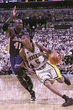 As a member of the Indiana Pacers, Rose helped the team get back on its feet after a disastrous 1996–97 season and make it to three consecutive Eastern Conference Finals appearances. Rose became the first player in eight years other than Reggie Miller to lead the Pacers in scoring in the 1999–2000 season when he averaged 18.2 points per game for the eventual Eastern Conference Champions, winning the NBA Most Improved Player Award in the process, the first time in Pacers history. During the 2000 NBA playoffs, Rose scored 40 points during Indiana’s Eastern Conference Semifinals Game 1 win over the Philadelphia 76ers.[14] After winning that series, and helping lead his team all the way to the 2000 NBA Finals, Rose went on to average 25 points per game in the six game series, including a 32-point effort in a game five win. However, the Pacers lost the series to the Los Angeles Lakers.[15] This playoff series is also remembered for Rose intentionally placing his foot underneath Kobe Bryant in game 2, while Bryant was landing back to the ground after shooting a jump shot, in an effort to cause Bryant injury (which Rose later admitted to intentionally doing).[16] Bryant would miss Game 3 of the series due to an injury after landing on Rose's foot.[16]