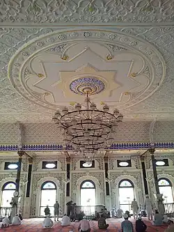 From the depth of the tank rise sixteen black stone arches, constructed in 1874, which support the whole fabric of the mosque, the upper storey upheld by five rows of wooden pillars, each of which contains a receptacle for sacred books. The arches in the tank were built in 1874 at a cost of Rs. 75,000; while other noteworthy additions to the premises were the large windows in the north, east, and south sides constructed in 1898, and the madrasa in 1902, at a cost of Rs. 20,000.