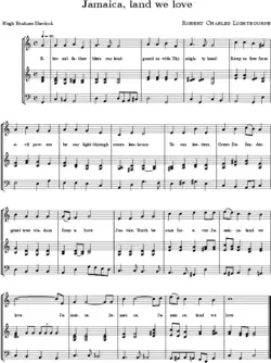 "Jamaica, Land We Love" is the national anthem of Jamaica, officially adopted in July 1962.[2] It was chosen after a competition from September 1961 to 31 March 1962, in which the lyrics of the national anthem were selected by Jamaica's Houses of Parliament. When Jamaica was granted independence on 6 August 1962, "Jamaica, Land We Love" continued to be officially used as the national anthem.