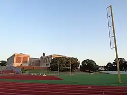 The northern half of the property is occupied by the large athletic complex.[2][11][6][12][23] Its main feature is a multi-purpose field for football, baseball, softball and other sports, circumscribed by a running track. At the southeast corner of the complex are tennis courts. The field is artificial turf, with dirt cutouts and mounds for baseball and softball.[2][11][23] It also contains a brick field house.[2][23] The entire field was renovated under the "Take the Field" initiative in the early 2000s.[24] A concrete grandstand for spectators was originally planned but never constructed. It is now an open sloped grass lawn between the field and school.[11][16]