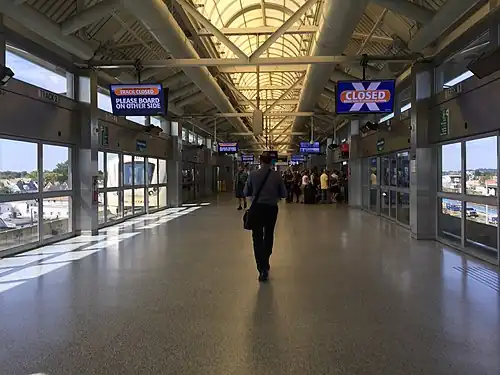 The platform measures approximately 240 feet (73 m).[39][40] The next stop to the south is Federal Circle, followed by the six JFK airline terminal stops. West of the station the track curves to the left and runs south, above the Van Wyck Expressway.[40] Since it is owned by the Port Authority of New York and New Jersey, it uses a separate fare control from the LIRR. Passengers must pay their fare when either entering or leaving the station, as this station and Howard Beach are the only stations where fares are collected. MetroCard vending machines are located on both sides of fare control.[41][42]