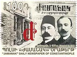 ![]() A 2018 stamp dedicated to the 110th anniversary of Jamanak, showing its old building, logotype, and founders, brothers Misak and Sarkis Koçunyan | |