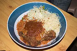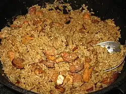 Jambalaya is a Creole/Cajun-American dish that originated in Africa and Europe and was brought to Louisiana during the colonial period.[5] These two cuisines blended in Louisiana; but also resulted in cultural and regional variations in how the dish is prepared.[6] There are a number of dishes with disparate origins that use some of the same ingredients. In West Africa there is a rice dish called "jollof rice" that according to researcher Kayla Stewart apparently developed from thiéboudienne, a Senegalese dish made of red rice, fish, cassava, and carrots.[7][8][9] Author Kelley Fanto Deetz also suggests jambalaya has roots in jollof rice.[10]
