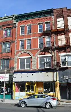 Clough's architecture retains a legacy on High Street from a handful of remaining buildings today, including the Latino Professional Building on the opposite corner of Dwight and High from where the Marble Block once stood. Originally called the Ball Block for druggist Charles Ely Ball who operated his store out of there, the block was built in 1898.[10] During the 20th century the building saw its first two floors modified extensively for the Holyoke National Bank which moved into the building in 1915, and subsequently modified it to its present appearance.[11] In 2005 it was renovated by the New England Farm Workers' Council and rechristened The Latino Professional Building, receiving an award from the Massachusetts Historical Commission for its attention to original detail.[12] The building's architectural details show influence Clough drew from Italianate palazzo style architecture, notably in its pillared corner windows, ornate capitals and cornices.