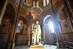 The interior features stained glass windows and window like panes representing the original 13 colonies, plus the state of Ohio, along with panels depicting War and Peace;[17] mosaics; deep red granite columns; and a 12-foot (3.7 m)-tall white Carrara marble statue of President Garfield by Alexander Doyle. An observation deck provides views of downtown Cleveland and Lake Erie.
